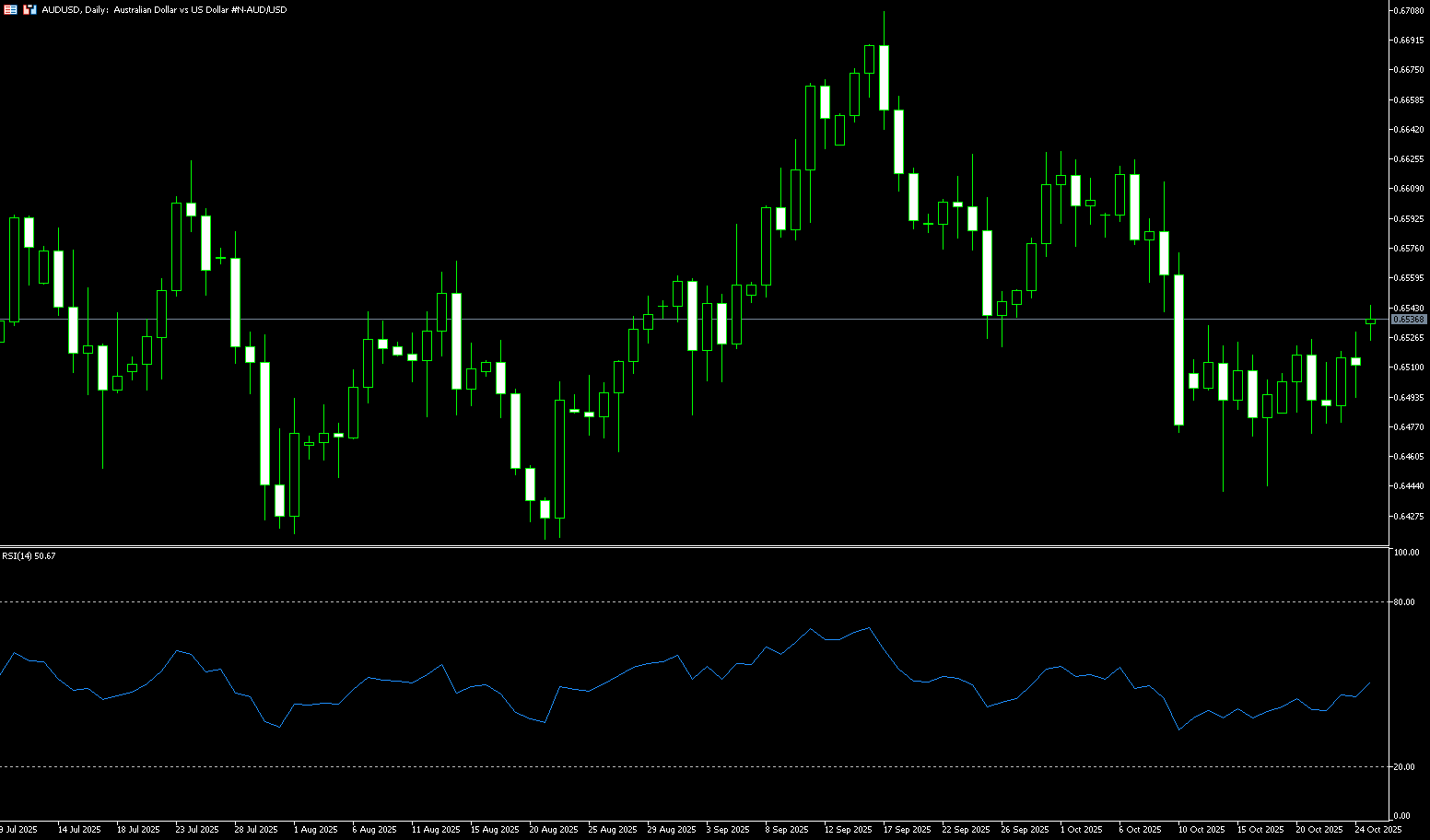 AUD/USD held steady at 0.6472 last week. - The AUD/USD pair has been trading within a narrow range of $0.6529 and is currently consolidating around $0.6510. Technical analysis on the daily chart suggests a persistent bearish bias, with the pair trading within a descending channel. Last week, the 14-day (0.6514) and 100-day (0.6535) simple moving averages formed a bearish "death cross" pattern. Furthermore, the 14-day relative strength index (RSI) retreated to around 45.00, further strengthening the bearish outlook. On the downside, AUD/USD could trade around the 0.6443 (October 17 low) and 0.6435 (200-day simple moving average), followed by the April low of $0.6414 and the 0.6400 (round number). A break below this support confluence would strengthen the bearish bias and push the pair towards a test of the May low of $0.6372. On the other hand, AUD/USD is currently hovering near the 0.6500 level. A successful break above this level would improve short-term momentum and support a test of the 50-day simple moving average at 0.6550. A break below this level would target the 0.6570 (34-day simple moving average) and the 0.6600 (psychologically significant) area.