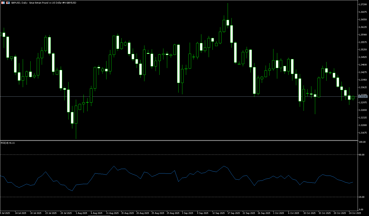 GBP/USD fell for six consecutive trading days last week and is currently trading just above $1.3300. Earlier, it fell to a one-week low of 1.3285. On the daily chart, GBP/USD is currently trading below its 20-day simple moving average at 1.3396, showing little change on the week. Technically, the pair is weak, holding below a pair of descending moving averages: the 20-day SMA at 1.3396 and the 50-day SMA at 1.3459. This bearish alignment places a short-term downward bias. Momentum indicators also reinforce this cautious tone, with the 14-day Relative Strength Index (RSI) dropping to 39.55, still below its 50-day midline, suggesting sellers maintain their advantage but not yet entering oversold territory. Initial resistance for GBP/USD is centered around 1.3360 (the 23.6% Fibonacci retracement level from 1.3726 to 1.3248), followed by the 1.3400 round-number mark and the 20-day SMA at 1.3397. A break below this level would target the 50-day simple moving average at 1.3459. On the downside, the first support level is 1.3248 (the October 14 low). The next support level is 1.3226 (the 200-day simple moving average), followed by the 1.3200 round-figure level.