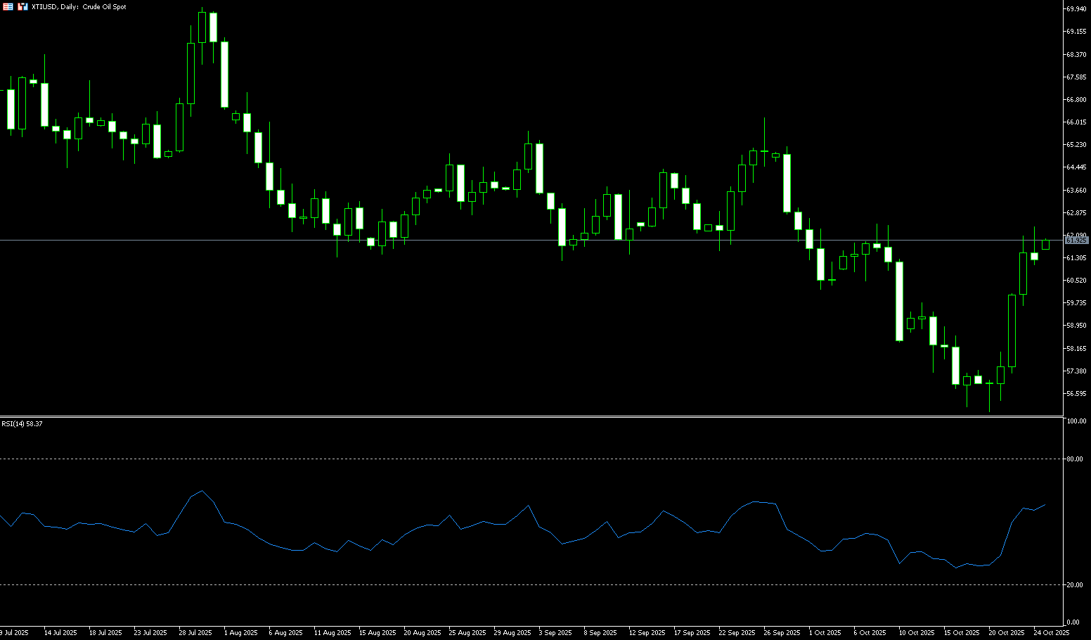 From a technical perspective, crude oil prices rose sharply last week. The rebound has shifted the short-term outlook from bearish to neutral to bullish. Momentum indicators have shown positive signals: the 14-day relative strength index (RSI), a technical indicator on the daily chart, has rebounded from near oversold territory to above the 55.00 midline, indicating that bullish momentum is strengthening; while the MACD, although in negative territory, has shown an upward trend, indicating that the bullish trend is strengthening, but has not yet formed a fully established upward trend. Therefore, on the upside, the initial resistance for US crude oil is at 62.68 (65-day simple moving average) - $62.44 (October 9 high). If the price breaks through and holds above this resistance range, the next resistance level will be at $64.19, the 100-day simple moving average. Although this key moving average indicator has temporarily suppressed the upside, a strong break above this resistance level on the daily chart will confirm that the bulls have regained control and pave the way for a test of the next key resistance levels of $65.19 (September 29 high) and $65.21 (200-day simple moving average). On the downside, initial support is at $60.00 (market psychological level); The market is near Thursday's low of $59.65. Subsequent support is expected to be at $58.60 (9-day simple moving average) and $58.00 (round number mark).