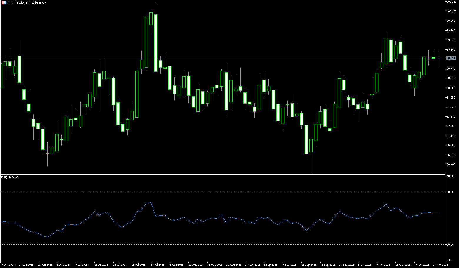 Before the end of last week, despite the release of weaker-than-expected US Consumer Price Index data for September, the US Dollar Index remained range-bound around 99.00. The dollar started the week on a solid note, though early momentum weakened as the week progressed. Despite this, the US Dollar Index managed to close slightly higher around 99.00, enough to erase the previous week's pullback and maintain its recovery from the 2025 low reached in mid-September. Currently, the US Dollar consolidated its gains before the weekend, trading within a 40-point range around 99.00. Its relatively restrained trading suggests traders are increasingly cautious ahead of next week's Federal Reserve meeting. The recent inflation data further fueled market expectations of a shift toward easing policy from the Fed. The focus remains on next week's Fed meeting, which is widely expected to conclude with a 25 basis point rate cut. However, an unexpected rise in inflation could reignite concerns about the risk of tariff-induced inflation, shake expectations of a December rate cut, and provide additional support for the US dollar. While technically, the index still has the potential to rebound above 99, short-term market sentiment is bearish—unless the Federal Reserve sends hawkish signals at next week's meeting, this bearish pattern is unlikely to change.