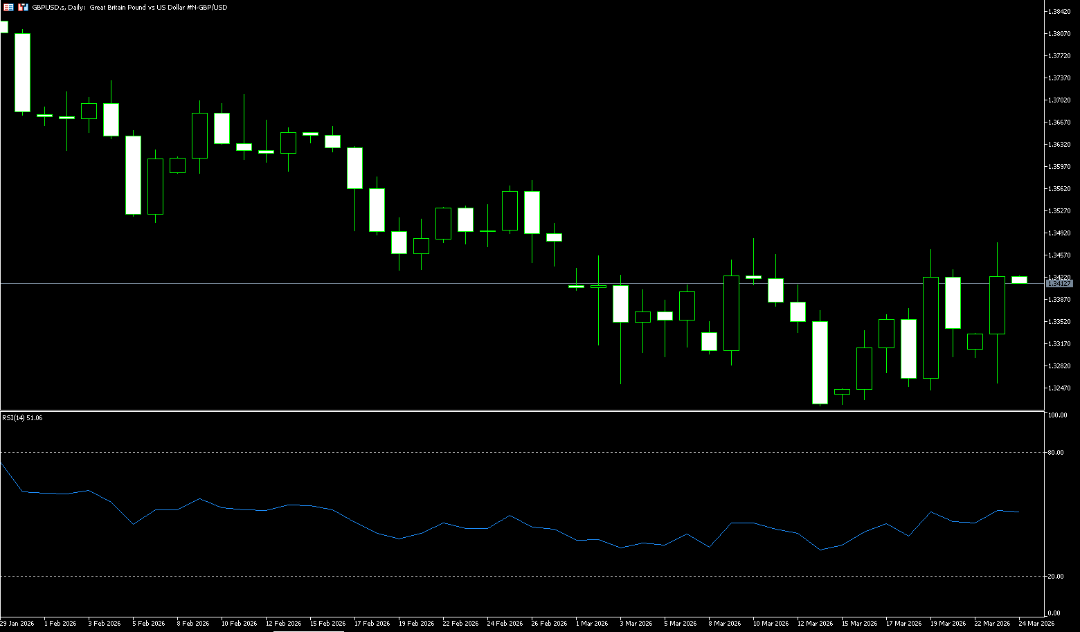 On the daily chart, GBP/USD is mildly bearish in the short term, with the spot price holding below the flattening 200-day simple moving average at 1.3433 and trading below the Bollinger Band middle line at 1.3387, limiting price action to the lower half of its trading range. The 14-day RSI is around 46, reinforcing the weakening bullish momentum rather than significant selling pressure, indicating that sellers still have the upper hand, but the decline is restrained rather than impulsive. Near-term support lies near the March 17 low of 1.3273; a break below this area would expose the next support level around the psychological level of 1.3200. Initial resistance is located at the 200-day simple moving average at 1.3433 and the 1.3450 area. A daily close above this resistance level would help neutralize bearish sentiment and pave the way for a further push towards the 1.3500 level.
