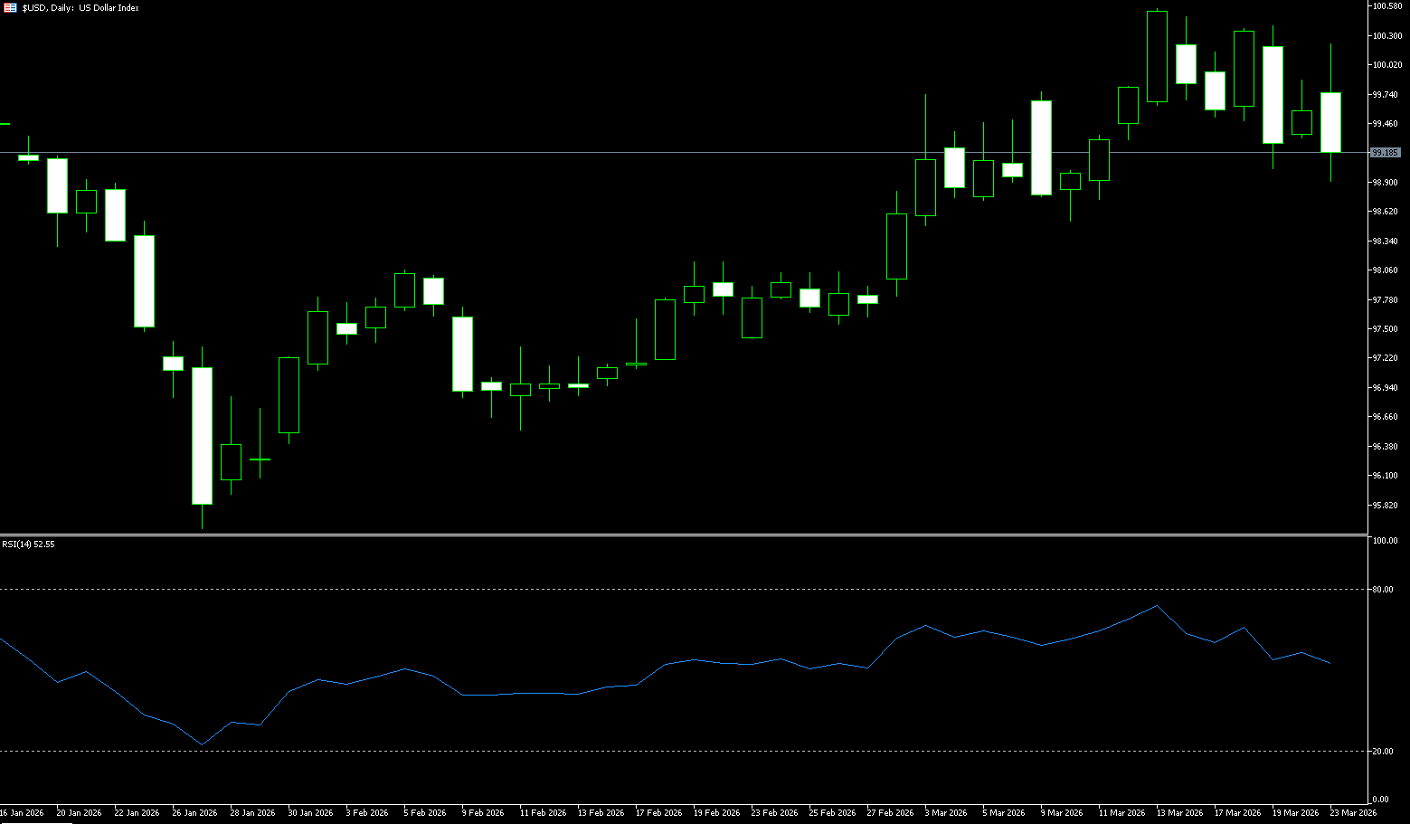 The US dollar index climbed above 100 early in the week, extending gains from the previous trading day, as escalating tensions in the Middle East increased safe-haven demand for the currency. Subsequently, US President Trump instructed the War Department to postpone any and all military strikes against Iranian power plants and energy infrastructure for five days, depending on the effectiveness of ongoing meetings and discussions. The immediate market reaction to the dollar index was a drop from 100.15 to 98.88, last trading around 99.10, after Tehran warned that it would target key US and Israeli assets in the region if its energy facilities were attacked. High oil prices continue to exacerbate inflation concerns and reduce the likelihood of a near-term Fed rate cut; some traders now expect a rate hike by the end of the year. The European Central Bank, the Bank of England, and the Bank of Japan also kept interest rates unchanged but indicated they were prepared to tighten policy further if inflationary pressures persist.